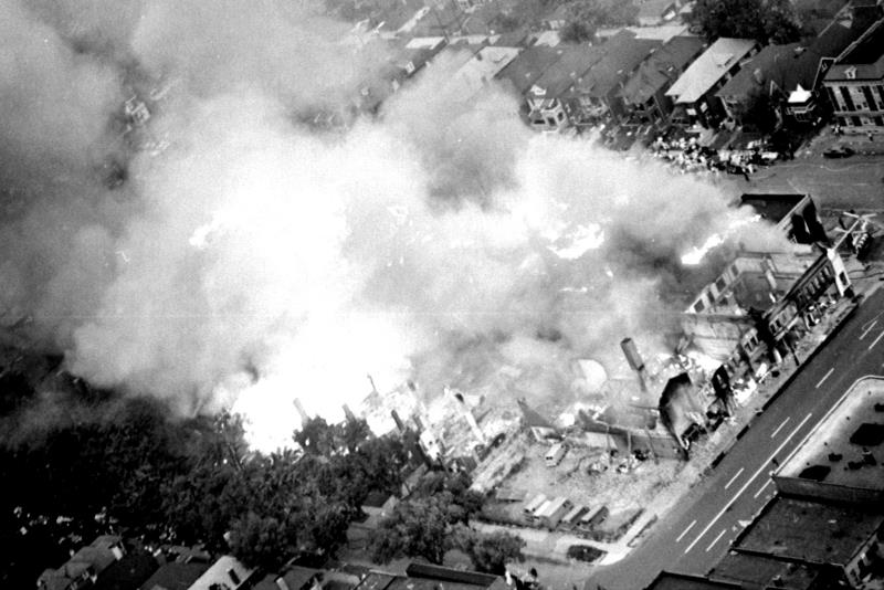 Aerial view of the Blaine / Pingree block off Linwood Avenue being consumed by fire. The scene was reminicent of Dante's Inferno in which the sign above the gate to Hell read: